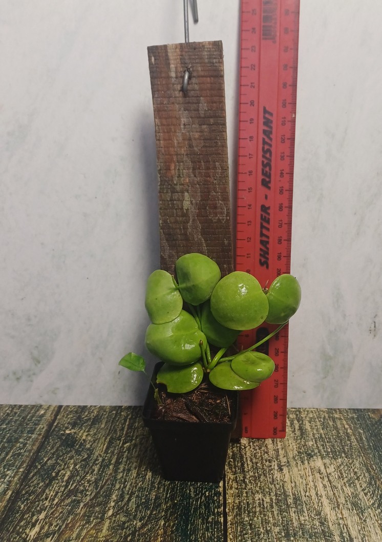 This Dischidia has shell-shaped leaves that have a shingling habit. Bell-shaped creamy coloured flowers with pink tint.