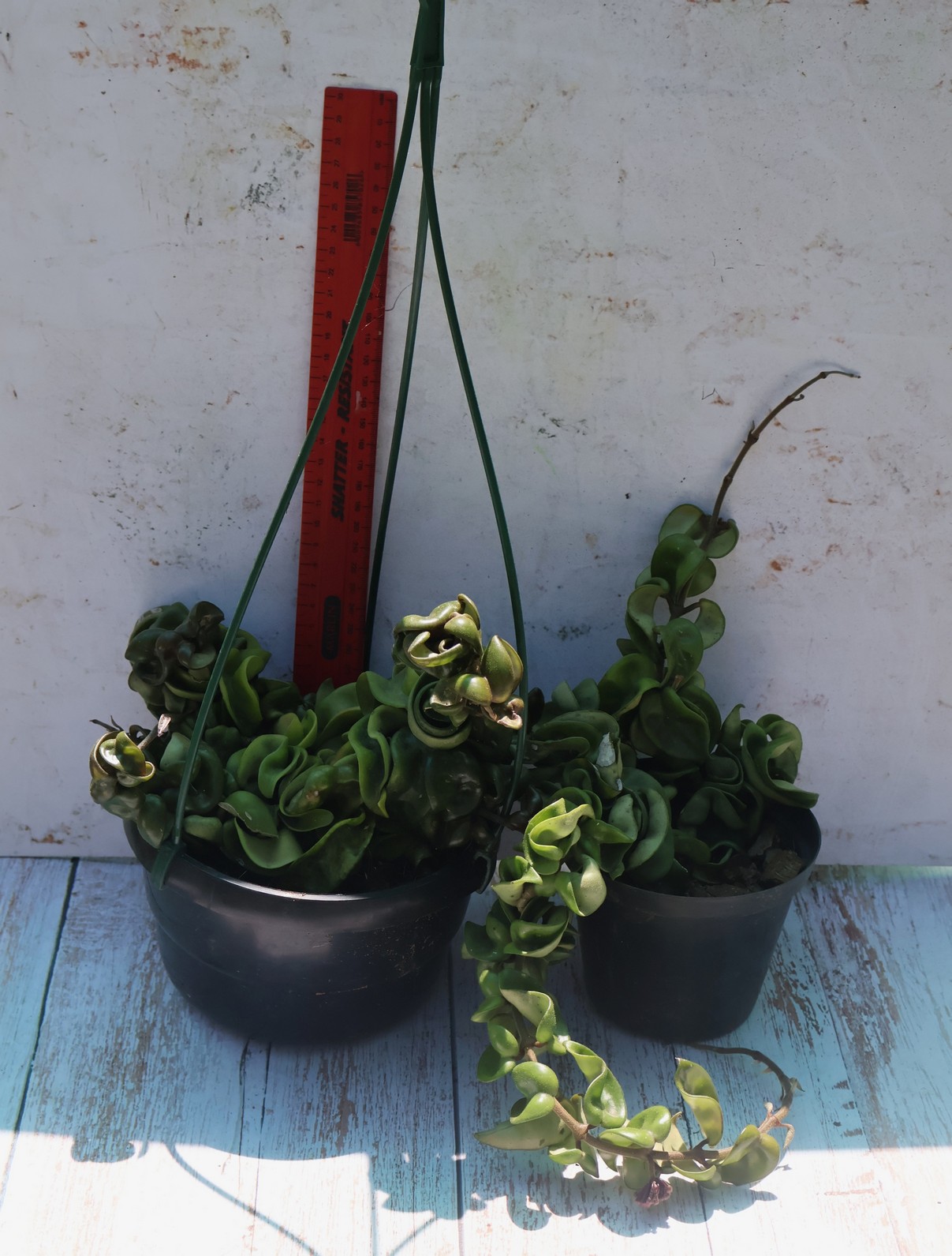 This is a popular but slightly slower growing Hoya.  It has curly leaves closely packed on vining stems.  The flowers are pretty white traditional carnosa style blooms.